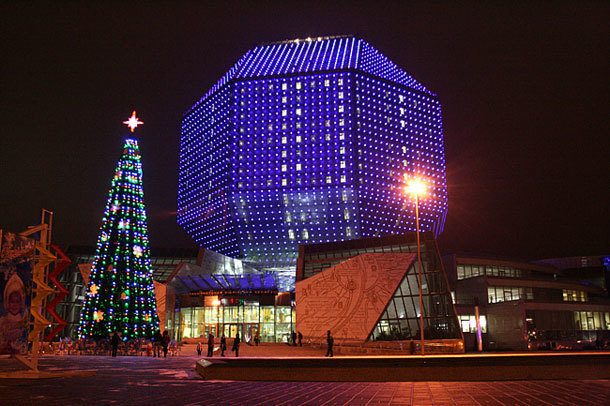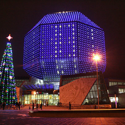 18:00 - Посещение обзорной площадки Национальной Библиотеки (при условии работы). Крупнейшая библиотека Беларуси, информационный и социокультурный центр страны. Здание библиотеки построено в форме ромбокубооктаэдра, который покрыт стеклом. Генеральный директор — Вадим Гигин.